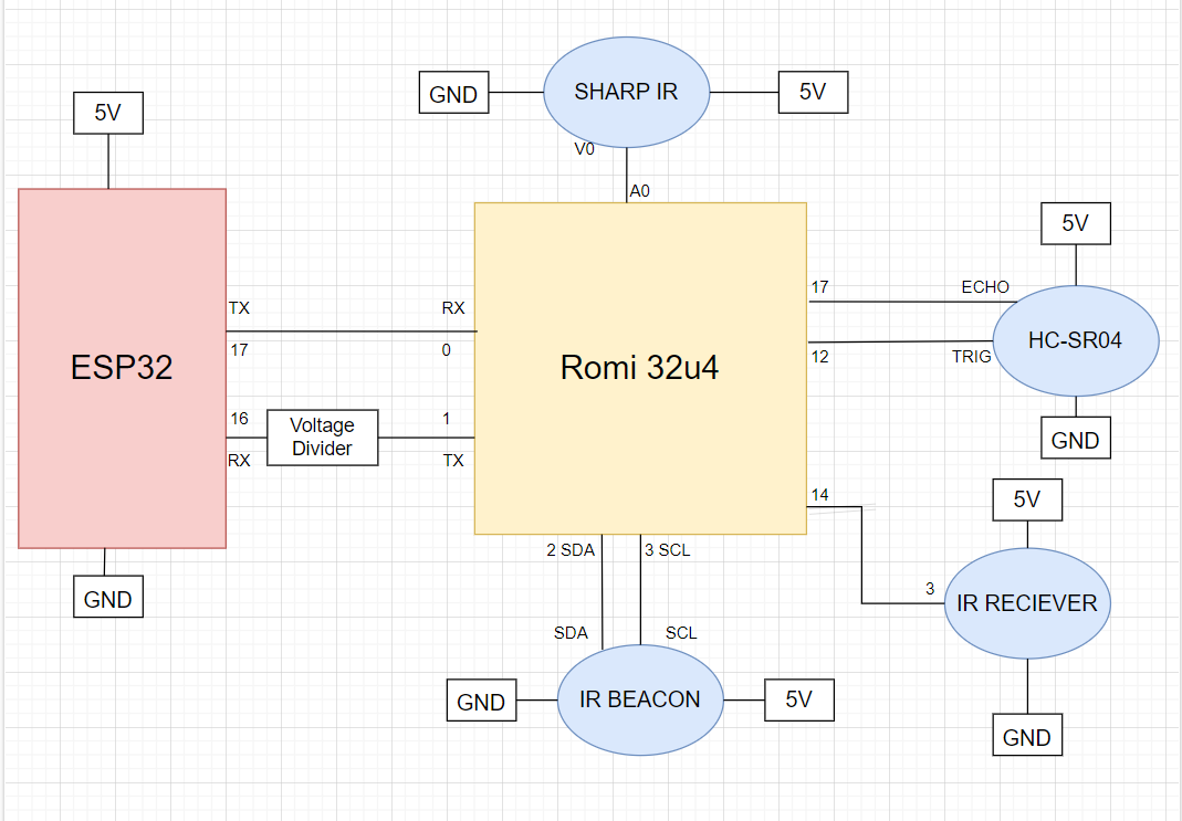 HC-SR04 was used for wall following due to its overall reliability. Echo must be on an interrupt pin for good readings. Sharp IR was chosen for wall detection, worked well as mechanical solutions could account for its range issues. The IR Receiver was wired to pin 14 as an interrupt because remote signals can be very important for emergency stops. The IR Beacon was wired into I2C for ease of access and data capabilities. ESP32 was wired in UART because of it’s data capabilities and ease of access. Note the diagram to the left is for the Romi that searches for the IR button. The other Romi's have either an OpenMV camera to read an april tag, or a IR emitter to emit a signal.