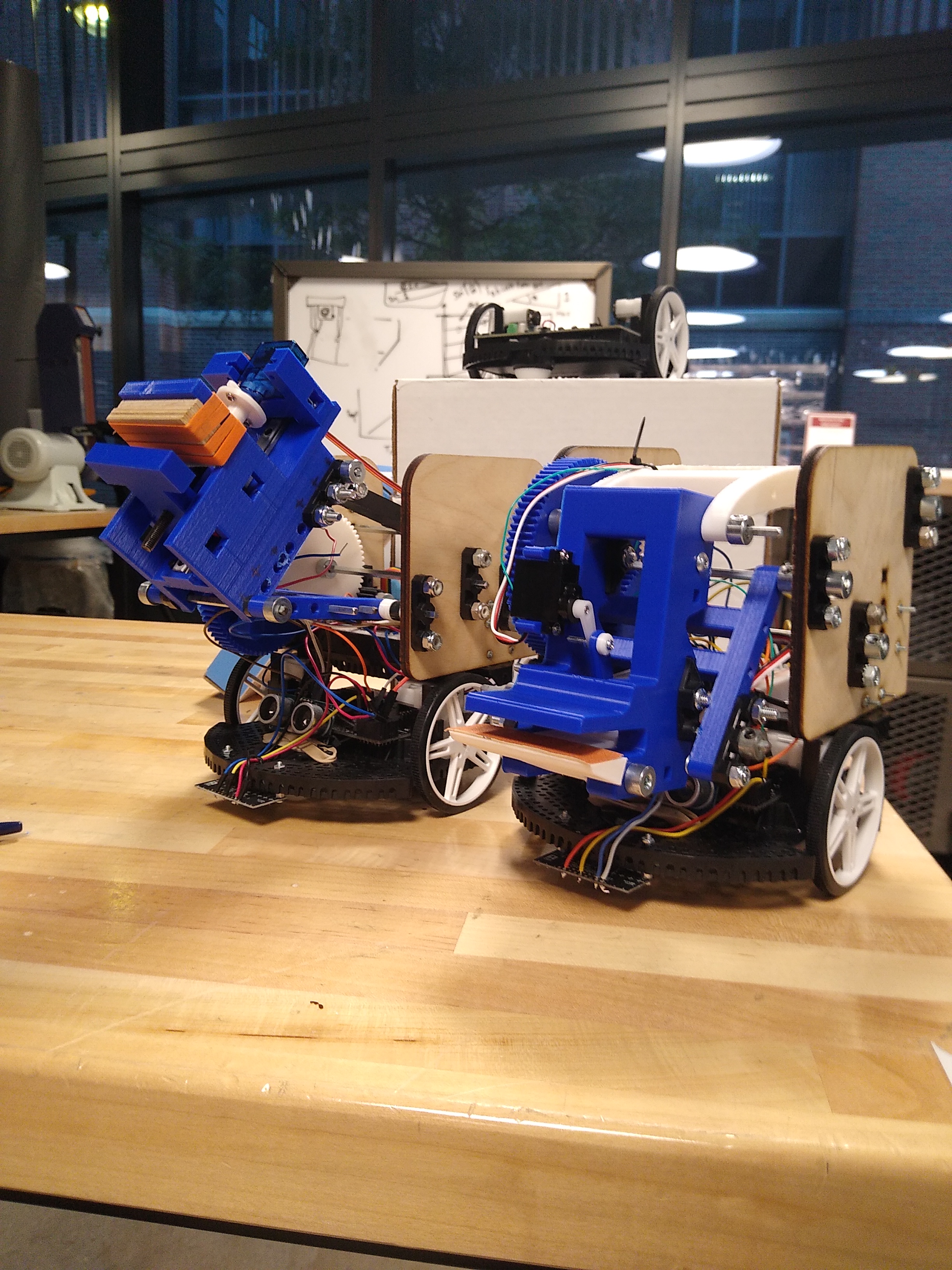 In order to ensure we could reach 3 points to grab metal plates hanging at specific angles, we created a 3D model in solidworks to properly simulate the motion of the robot. The arms bottom and top arms of the robot are different lengths in order to rotate the angle of the acquisition device. We 3D printed and lasercut these models in order to assemble the robots.