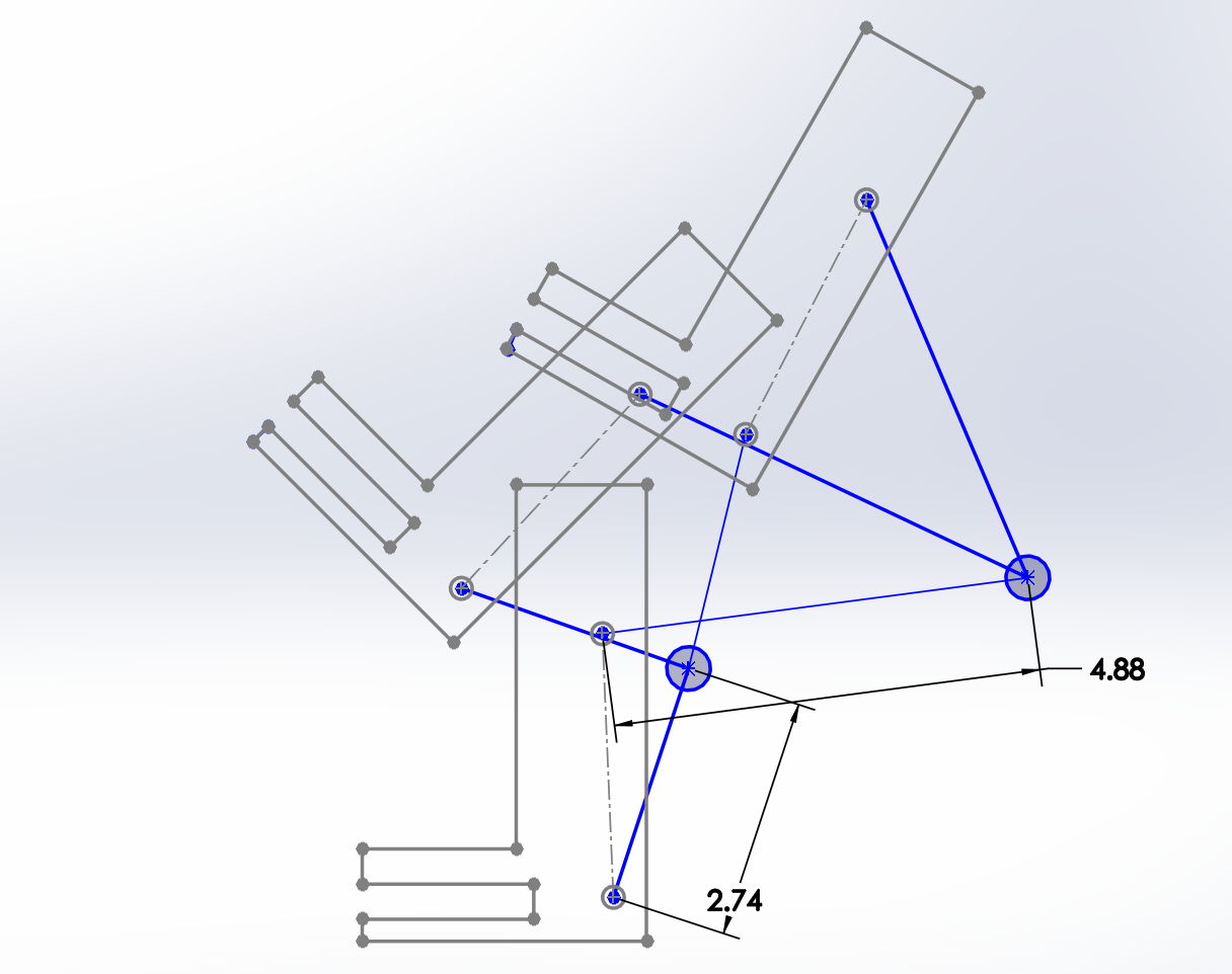 I created a solidworks sketch in order to properly plan the motion of the grabber to meet the requirements of the challenge. Using math and geometry, we could plan the motion of the grabber to reach all desired points using a fourbar mechanism.