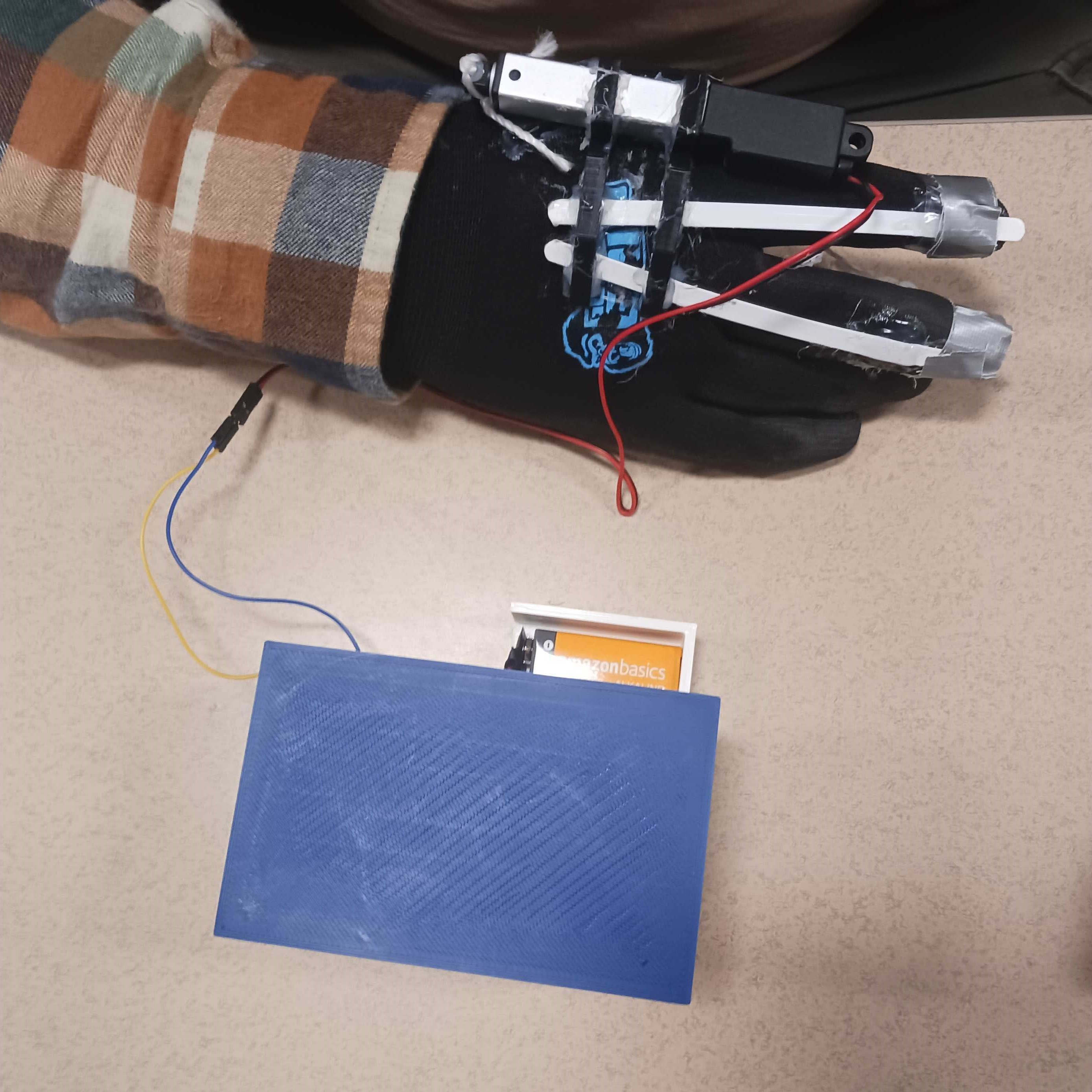 The glove uses a linear actuator in order to contract and release fingers. The motor is tied with a string to the ends of fingers, and when it extends the fingers are forced to grip, and when it releases flat springs return the hand to an open grip. To ensure the motor has enough power to grip small objects, I conducted research into similar projects. I 3D modelled mounts that are 3D printed and attached onto the glove in order to secure the motors.
